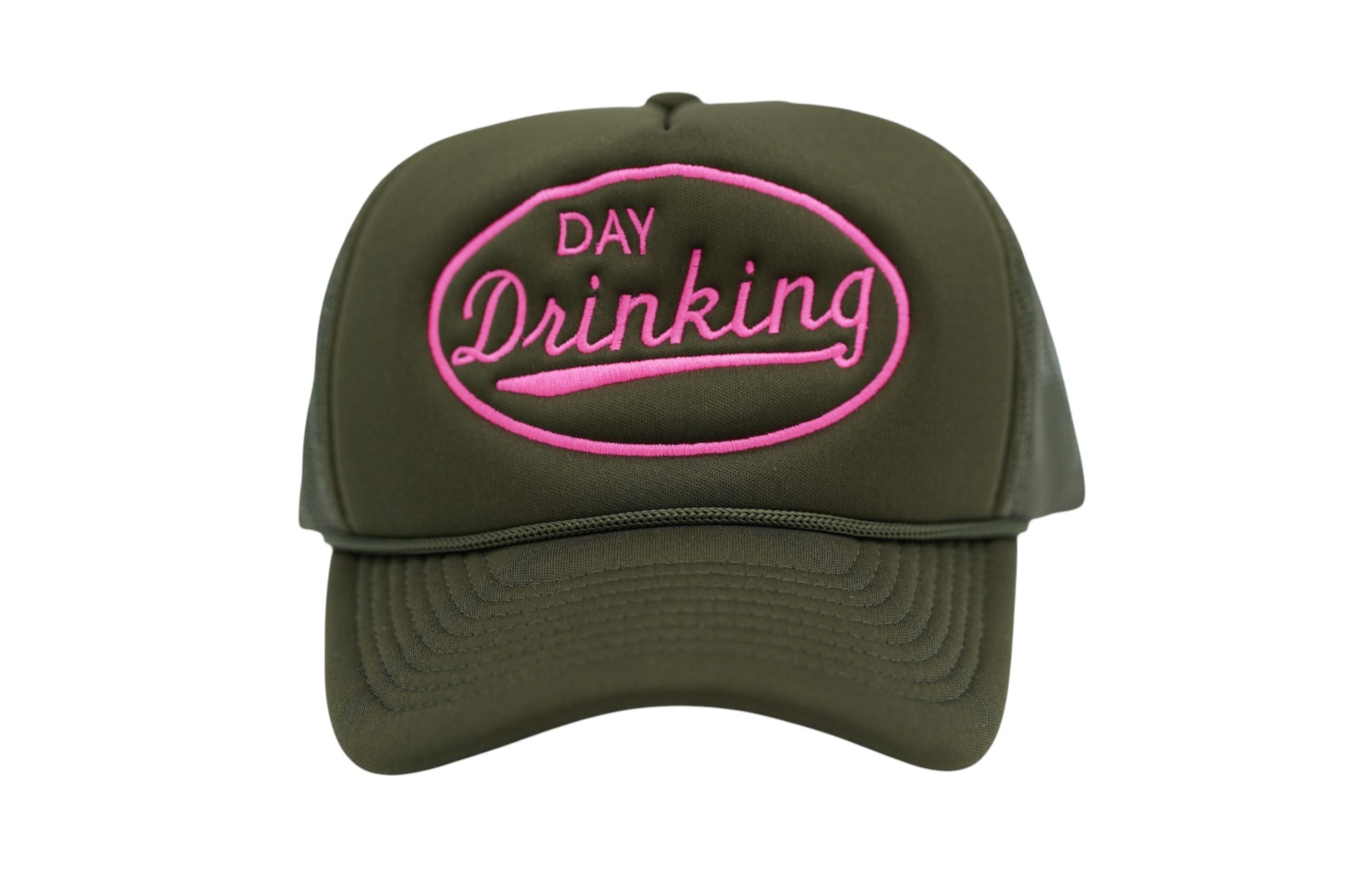 Kick back and embrace the good vibes with the Day Drinking Trucker Hat. Featuring bold pink embroidery on an olive foam-front crown, this hat delivers the perfect mix of humor and style. The breathable mesh back keeps you cool, while the structured retro fit makes it ideal for sunny days, tailgates, lake trips, and weekend hangs.