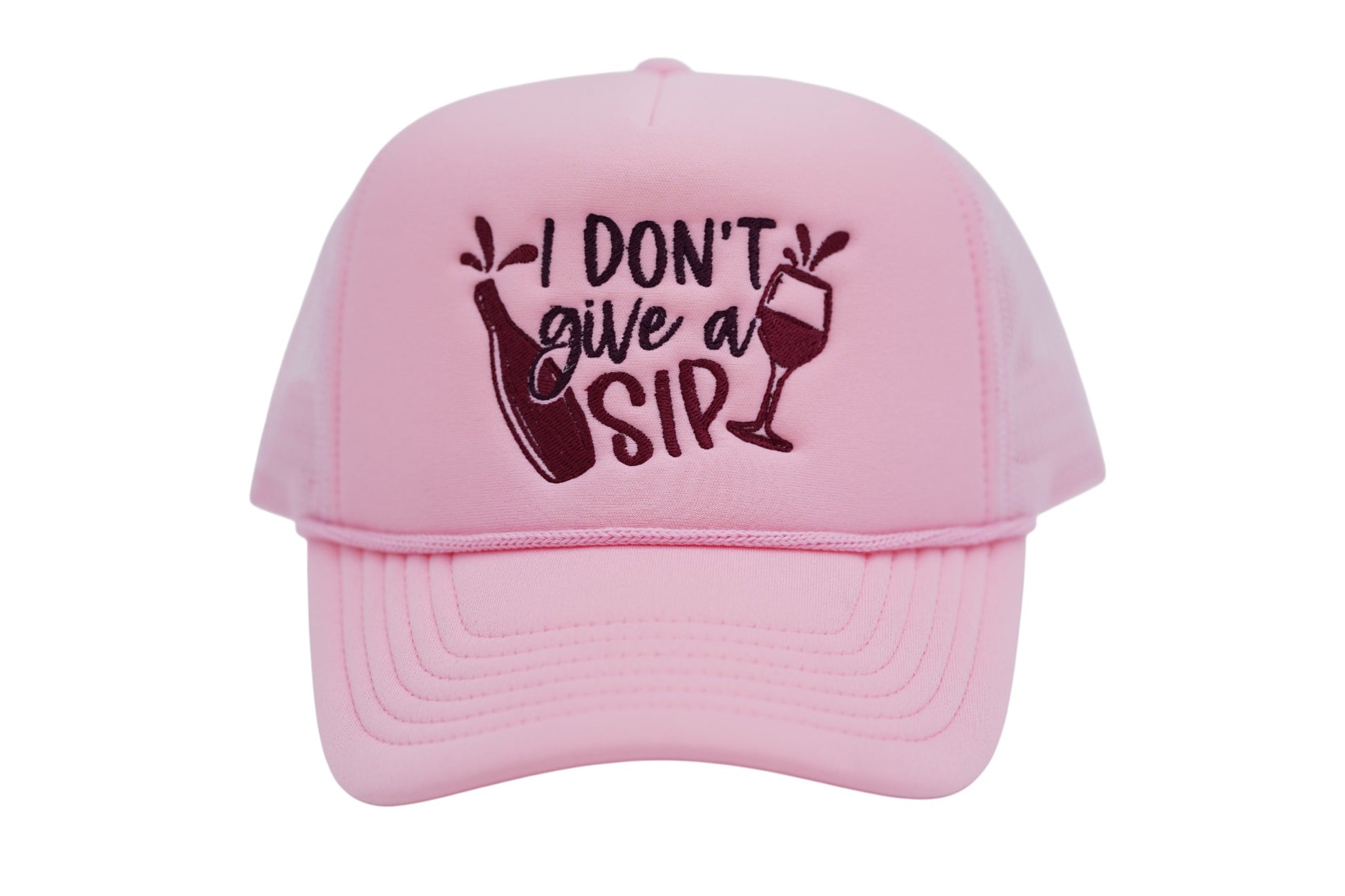Make a statement without saying a word in the I Don’t Give a Sip Trucker Hat. This playful pink cap features bold embroidered graphics of a wine bottle and glass, capturing the carefree spirit of anyone who’s just here for a good time. Lightweight mesh backing keeps you cool, while the structured foam front adds that classic retro trucker style.