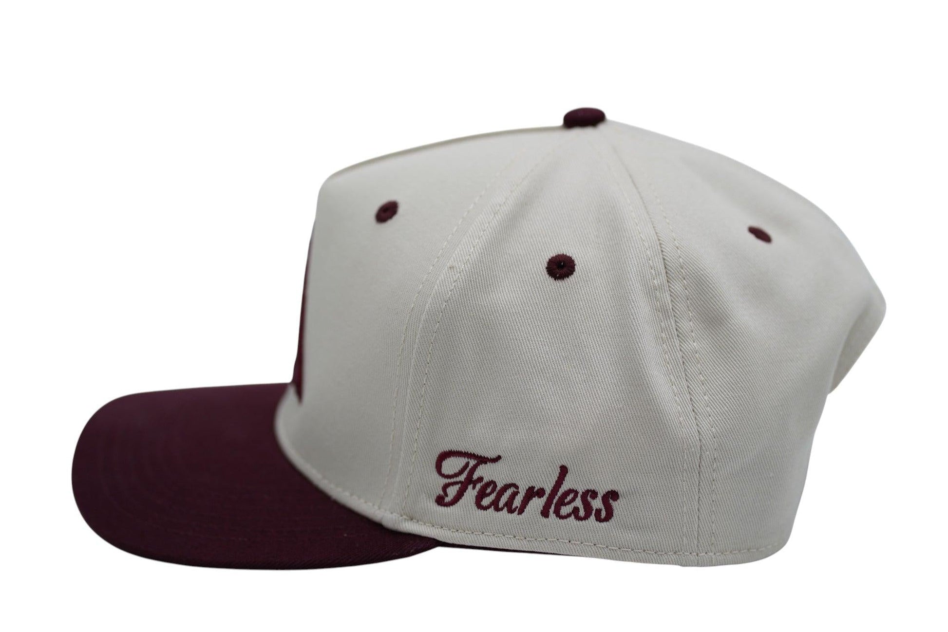Step up your style and mindset with the ParkerBuilt "Fearless" Performance Hat. Designed with a bold embroidered GYH logo on the front and the word “Fearless” stitched on the side, this hat is a reminder to lead with courage every day. It features a structured low-profile fit, durable construction, and a premium maroon bill that adds a clean contrast to the cream crown.